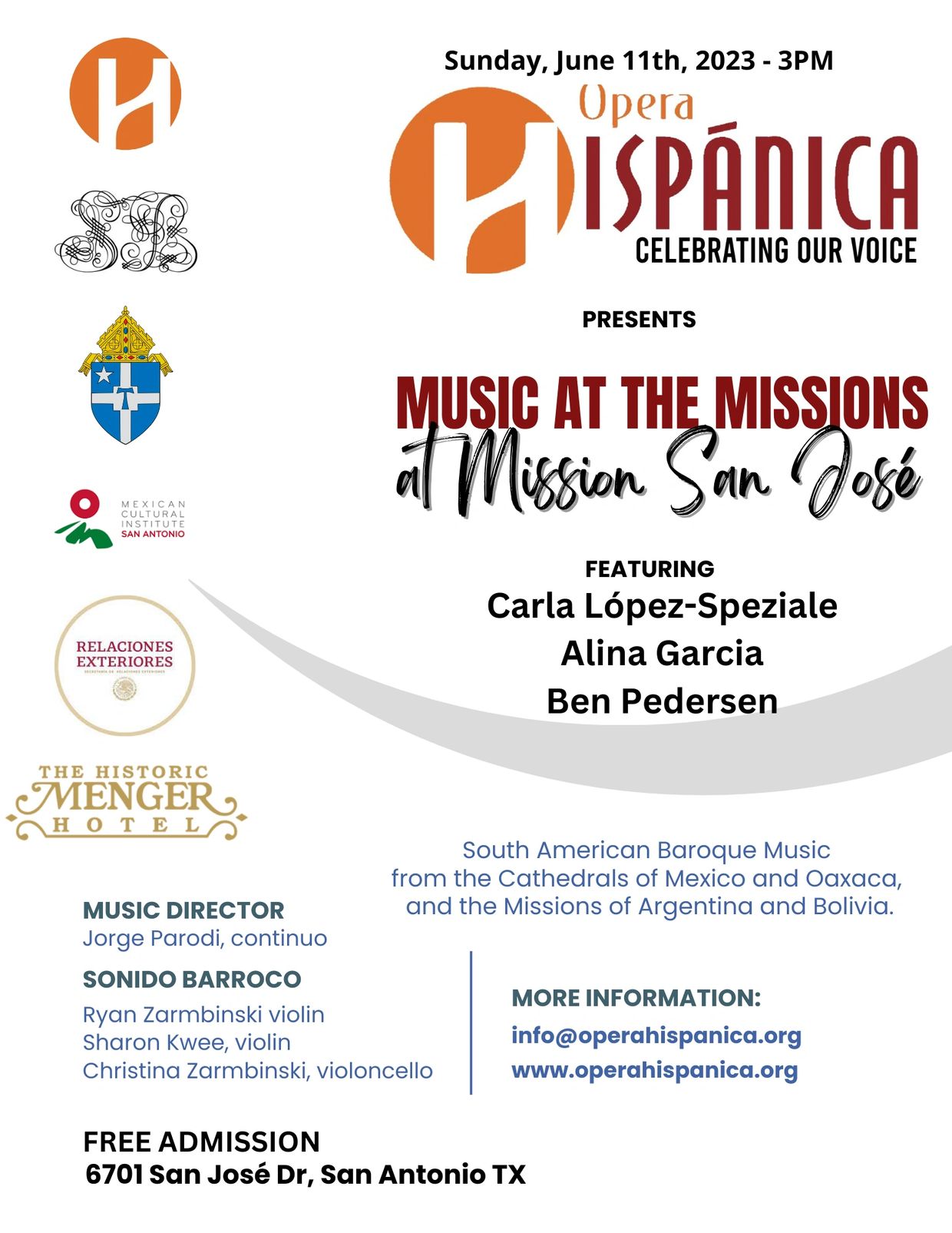 Opera Hispánica, the premier opera company in the United States of America focused exclusively on the Hispanic operatic repertoire, is proud to present a series of recitals to take place at Mission San José, one of the historic Missions of San Antonio, Texas, declared a World Heritage Site by UNESCO; and at the San Fernando Cathedral, the oldest cathedral sanctuary in the US. Performances will take place on June 11th at 3PM (Mission San Jose) and 7:30 PM (San Fernando Cathedral). Featuring Mexican opera star, mezzo Carla López Speziale, and two young talented singers from The Juilliard School, Alina García, Ben Pedersen, with the direction of Maestro Jorge Parodi, OH General and Artistic Director, and faculty at Juilliard.